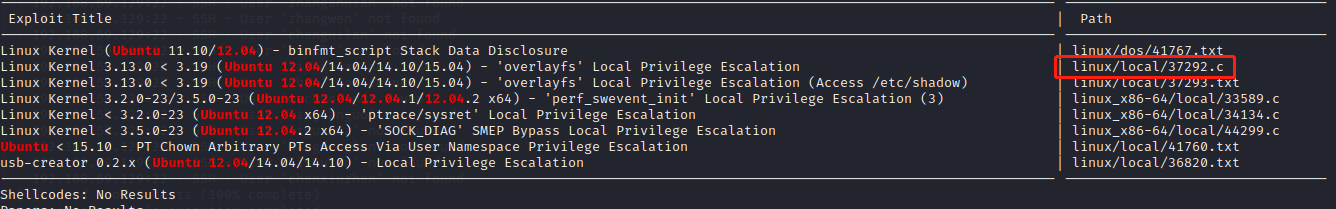发现ubuntu12.04, 内核版本3.13.0 ,使用kali 中的searchsploit搜索,使用37292.c 进行提权