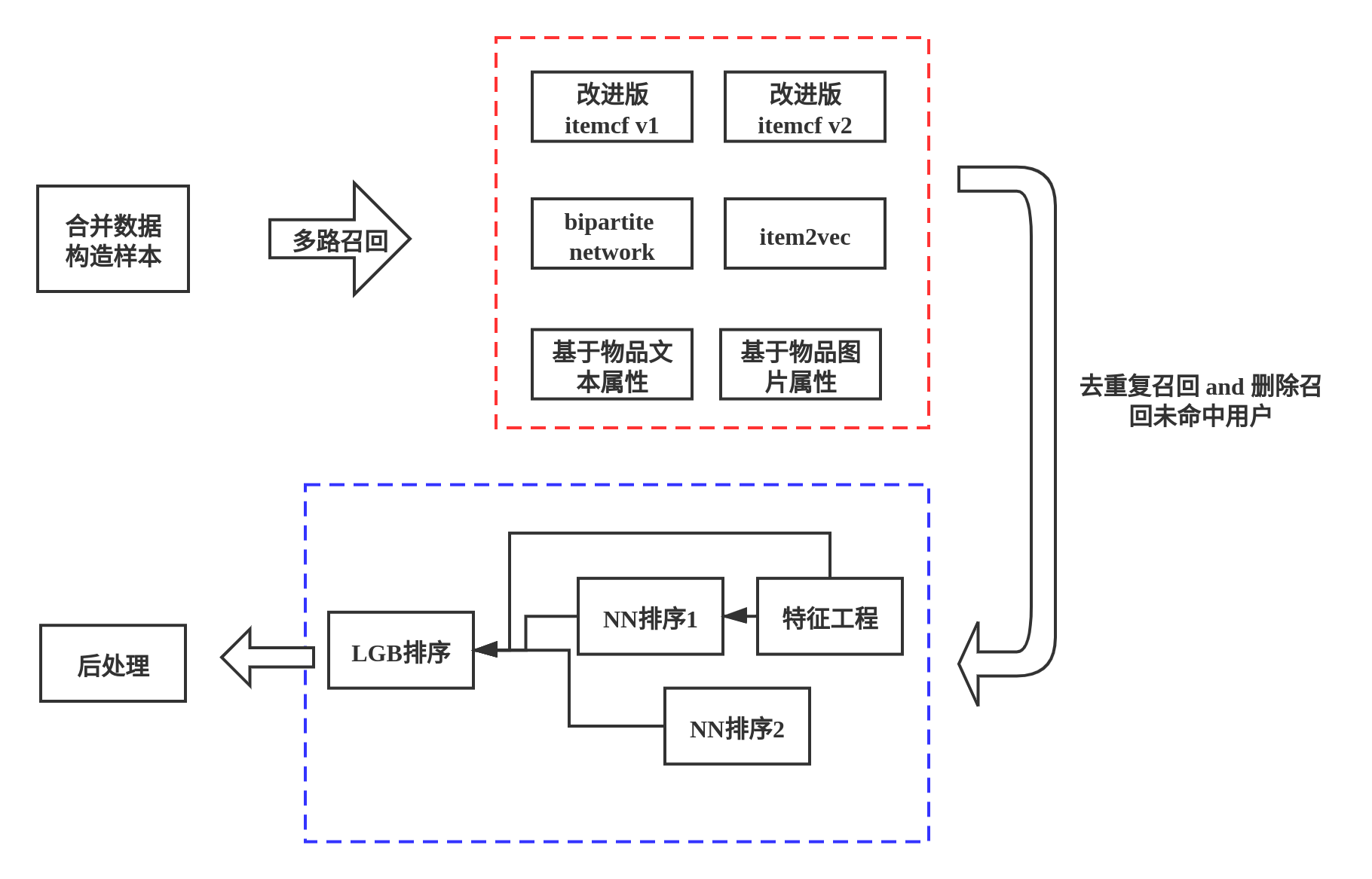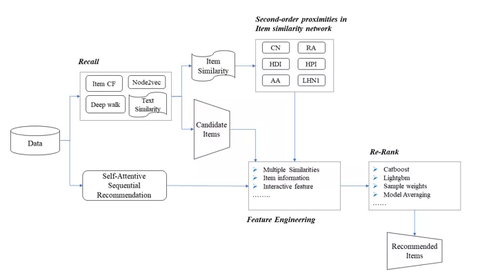 召回阶段,还是使用了常见的召回方法,user-cf、item-cf、swing、bi-graph,但是都对其进行了一定的改进,都在其中加入了用户的活跃度或者商品的热度(这是根据本赛题特性——发掘出现频次少的商品)后面一种召回方法我觉得很新颖,针对序列推荐场景下的一种模型——SR-GNN,这种模型天然适用于这种场景,但是使用原始论文的效果不佳,在这里对网络进行了很大的改进,主要有:物品嵌入初始化,缺失物品属性的补全,带有节点权重的消息传播改造,加入位置编码,序列级别的嵌入表征,损失函数的改造。改造后的效果,比其他几种方法还要好。从这里我们可以看出,在使用原始论文方法的时候,我们还要分析现有场景的特点,进行相应的改造,才能发挥出最大的效果。