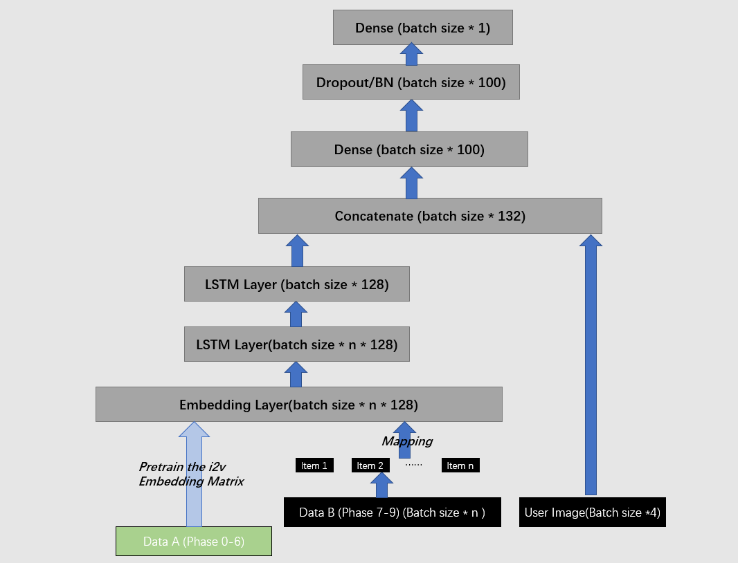 排序阶段,自定义了一种排序模型,使用两种深度模型做一次特征提取,计算得到初步的预测概率特征,然后与其余构造的特征一起放入LGB模型,做最后的点击概率预测。我觉得这个方案的最大创新点就是在排序阶段,除了使用人工构造的特征,还利用LSTM处理序列的特性,利用深度学习网络做了一次特征的提取。深度学习可能会得到人为无法构造的特征。