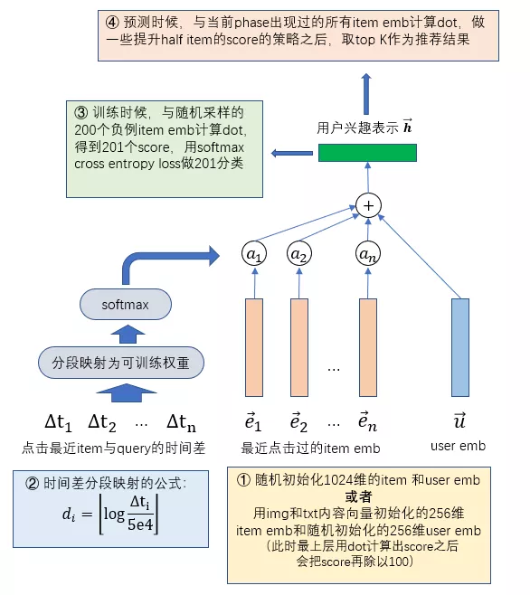 纯深度学习在推荐系统上的应用,端到端的最大程度体现,暴力完美的解决了问题,在阅读完之后,感觉解决问题尽然如此之快,在将商品与用户的相关embedding输入之后,直接暴力计算点击概率,将召回与排序合二为一,简单明了,不过在实现过程中,加入了attention机制
