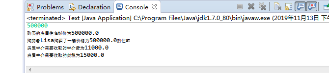 在Test类中定义购房对象——姓名Lisa,从控制台输入她计划买的房屋标价,如650000元。请你通过上面定义的接口和类,实现她通过中介买房的过程,显示需交纳的中介费和契税。