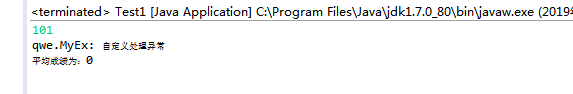public class Test1 { public static void main(String[] args) { int sum = 0; int ave=0; try { for (int i = 0; i < 5; i++) { Scanner reader = new Scanner(System.in); int score = reader.nextInt(); if (score > 100 || score < 0) { throw new MyEx("自定义处理异常"); } sum+= score; } } catch (MyEx e) { System.out.println(e.toString()); } System.out.println("平均成绩为:" + sum/ 5); } }