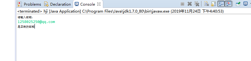 import java.util.Scanner; public class hji { public static void main(String[] args) { System.out.println("请输入邮箱:"); Scanner reader = new Scanner(System.in); String j = reader.next(); String regex = "\\w+[@]\\w+[.][comn]+[.]*[comn]*"; if(j.matches(regex)) System.out.println("是正确的邮箱"); else System.out.println("不是正确的邮箱"); } }