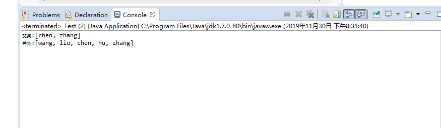 import java.util.ArrayList; import java.util.List; public class Test { public static void main(String[] args) { List<String> a=new ArrayList<>(); List<String> b=new ArrayList<>(); a.add("chen"); a.add("wang"); a.add("liu"); a.add("zhang"); b.add("chen"); b.add("hu"); b.add("zhang"); List<String> c = new ArrayList<String>(a); a.retainAll(b); System.out.println("交集:"+a); c.removeAll(b); c.addAll(b); System.out.println("并集:"+c); } }