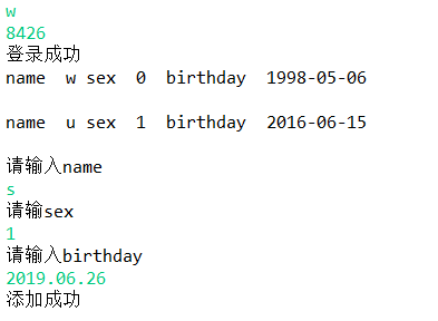 import java.util.Scanner; import com.mysql.jdbc.PreparedStatement; import java.sql.Connection; import java.sql.DriverManager; import java.sql.ResultSet; import java.sql.SQLException; import java.sql.Statement; public class TestMain { public static void main(String[] args) { // TODO Auto-generated method stub Scanner sc = new Scanner(System.in); String username = sc.next(); String password = sc.next(); Connection con = null; Statement st = null; ResultSet rs=null; try { Class.forName("com.mysql.jdbc.Driver"); con = DriverManager.getConnection("jdbc:mysql://localhost:3306/test","root",""); st = con.createStatement(); String sql = "insert into t_login(username,password) value('" + username + "','" + password +"')"; int count = st.executeUpdate(sql); if(count > 0) { System.out.println("登录成功"); } else { System.out.println("登录失败,请重新登录"); } rs=DB.getInstance().executeSelect("select * from t_user", args); while(rs.next()){ System.out.println("name "+rs.getString(2)+"\t"+"sex "+rs.getString(3)+"\t"+"birthday "+rs.getString(4)+"\n"); } System.out.println("请输入name"); String name=sc.next(); System.out.println("请输sex"); String sex=sc.next(); System.out.println("请输入birthday"); String birthday=sc.next(); String sql1="insert into t_user (birthday,sex,name)values('"+birthday+"','"+sex+"','"+name+"')"; int i=DB.getInstance().executeModify(sql1, args); if(i > 0) { System.out.println("添加成功"); } else { System.out.println("添加失败"); } } catch (ClassNotFoundException e) { e.printStackTrace(); } catch (SQLException e) { e.printStackTrace(); } finally { try { st.close(); con.close(); } catch (SQLException e) { e.printStackTrace(); } } } }