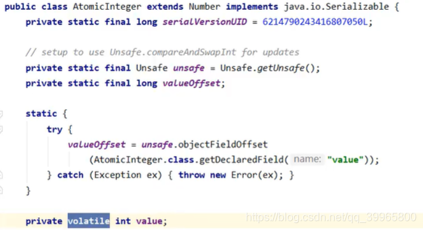 在上面代码中的AtomicInteger,保存值的value属性使用了volatile 。获取共享变量时,为了保证该变量的可见性,需要使用 volatile 修饰。