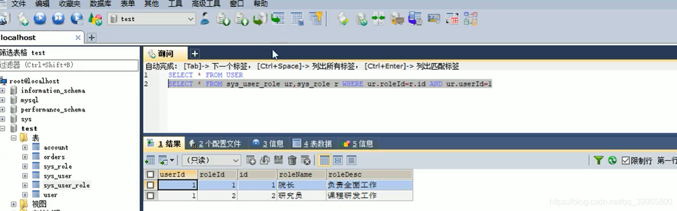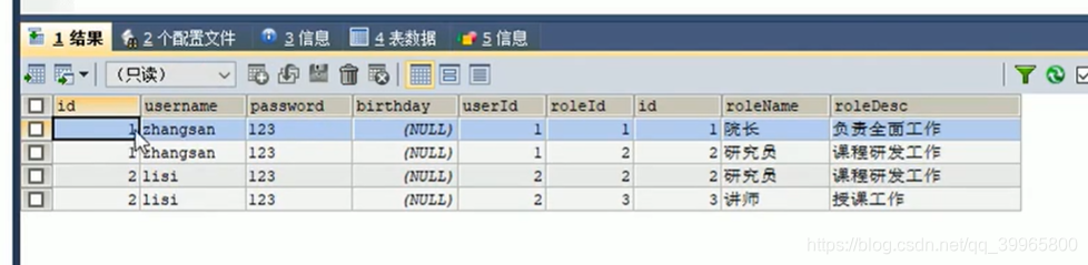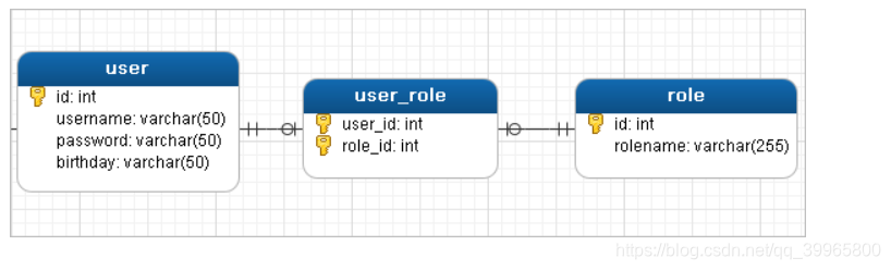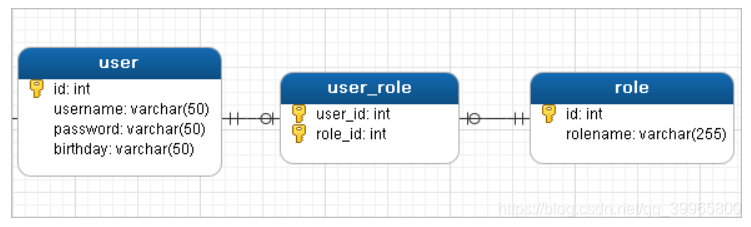 用户表和角色表的关系为,一个用户有多个角色,一个角色被多个用户使用