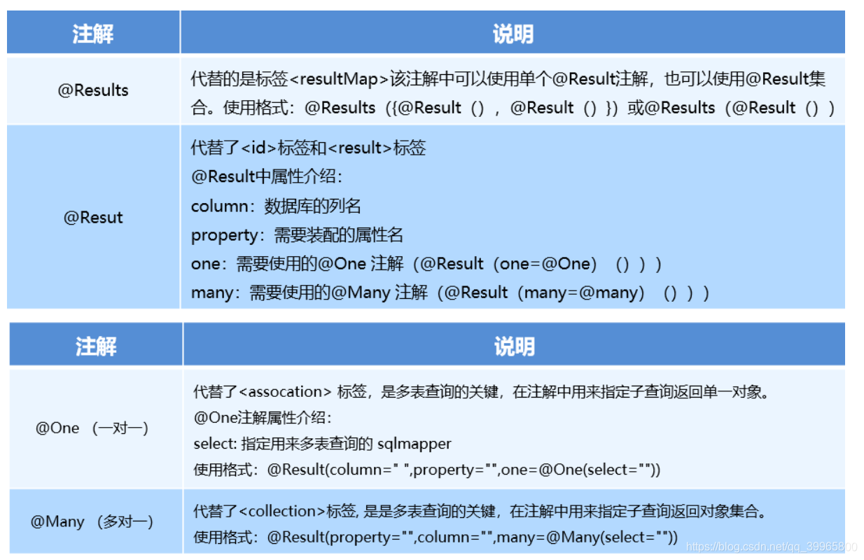 实现复杂关系映射之前我们可以在映射文件中通过配置<resultMap>来实现,使用注解开发后,我们可以使用@Results注解,@Result注解,@One注解,@Many注解组合完成复杂关系的配置