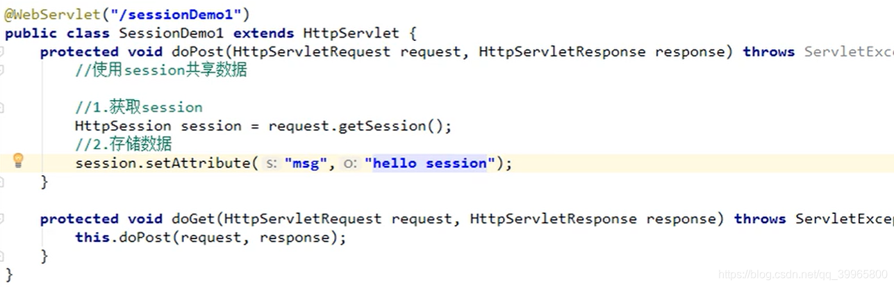 1. 概念:服务器端会话技术,在一次会话的多次请求间共享数据,将数据保存在服务器端的对象中。HttpSession