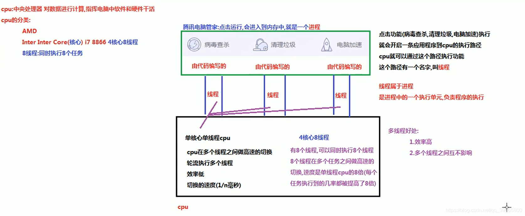 进程:是指一个内存中运行的应用程序,每个进程都有一个独立的内存空间,一个应用程序可以同时运行多 个进程;进程也是程序的一次执行过程,是系统运行程序的基本单位;系统运行一个程序即是一个进程从创 建、运行到消亡的过程。