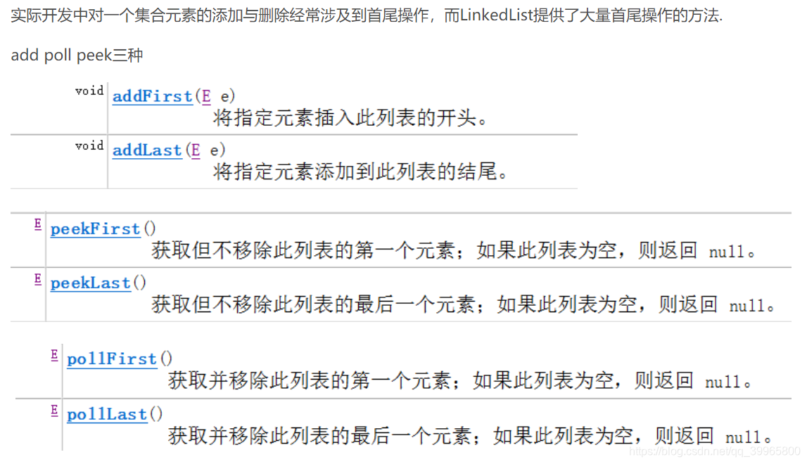 - public E removeFirst():移除并返回此列表的第一个元素。
