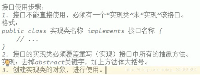 1. 接口不能直接使用,必须有一个“实现类”来“实现”该接口。