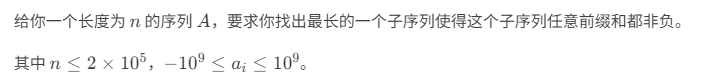 举个例子,例如 \(A=\{4,-4,1,-3,1,-3\}\),答案为 \(5\),因为我们可以选择 \(\{4,1,-3,1,-3\}\),其前缀和为 \(\{4,5,2,3,0\}\)。