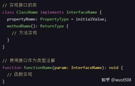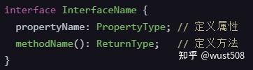 接口的定义:接口是一个抽象的类型,它规定了对象应该具备的结构,但不实现它。接口可以包含属性、方法,甚至是其他接口(称为嵌套接口)。下图是定义接口的基本语法。