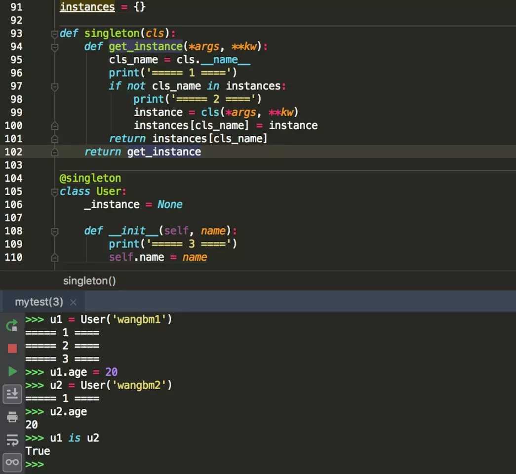 instances = {}def singleton(cls): def get_instance(*args, **kw): cls_name = cls.__name__ print('===== 1 ====') if not cls_name in instances: print('===== 2 ====') instance = cls(*args, **kw) instances[cls_name] = instance return instances[cls_name] return get_instance@singletonclass User: _instance = None def __init__(self, name): print('===== 3 ====') self.name = name |