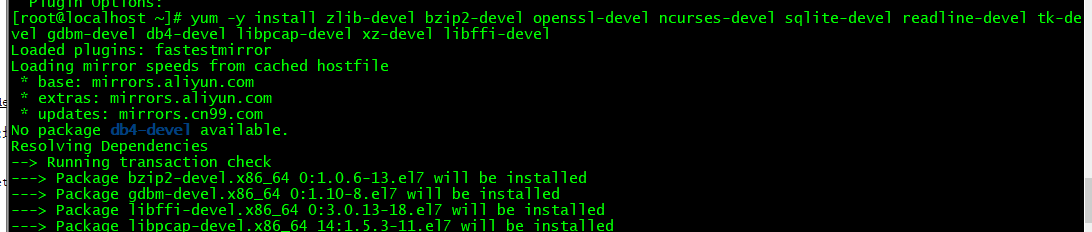 yum -y install zlib-devel bzip2-devel openssl-devel ncurses-devel sqlite-devel readline-devel tk-devel gdbm-devel db4-devel libpcap-devel xz-devel libffi-devel