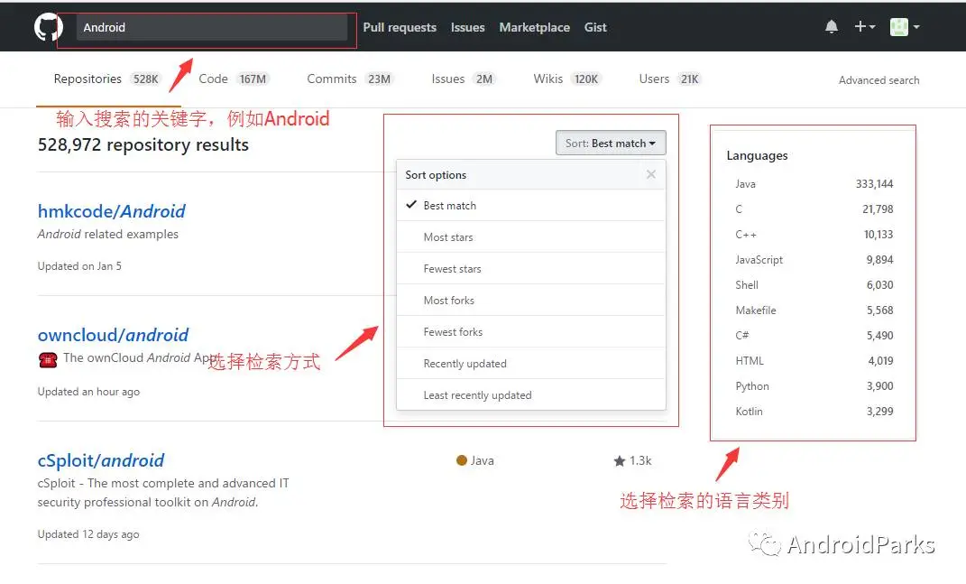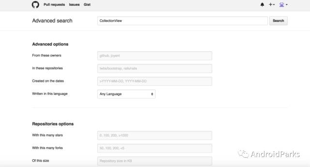 github搜索技巧,设定条件进行搜索:https://help.github.com/articles/searching-repositories/