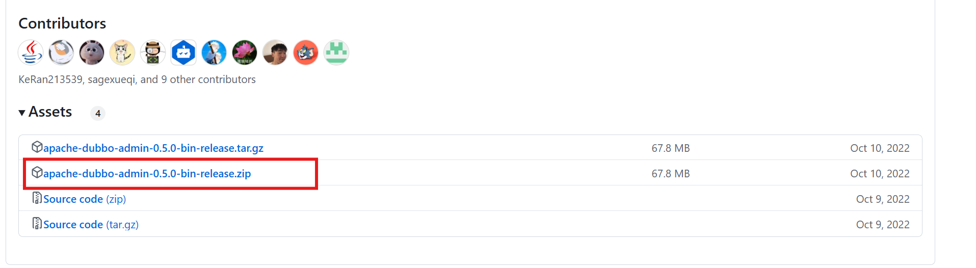 4、安装Dubbo admin,下载地址Release 0.5.0 · apache/dubbo-admin · GitHub,可以选择下载源码然后手动编辑打包部署,我这里直接偷懒也下载打包好的,启动方便