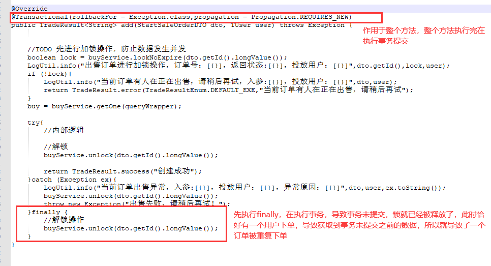 经过对代码逻辑的梳理和测试最终发现问题出现在finally方法上,因为事务是作用于整个方法,会先执行finally后在执行提交事物操作,当finall执行完成后锁已经被释放了,然而此时事物还未提交,恰好此时有一个用户提交了订单,导致获取的数据还是事务未提交之前的数据,结果就导致了同一个订单被过量销售的问题