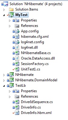 TestLb中主要是一个实体DriverInfo.cs及其映射文件。MyTest项目中主要是UnitTest1.cs文件以及其它一些应用类和配置文件。TestLb和MyTest项目中包含一个对NHibernate源码项目的引用,因文件太多,不提供下载,可到NHibernate官网下载: