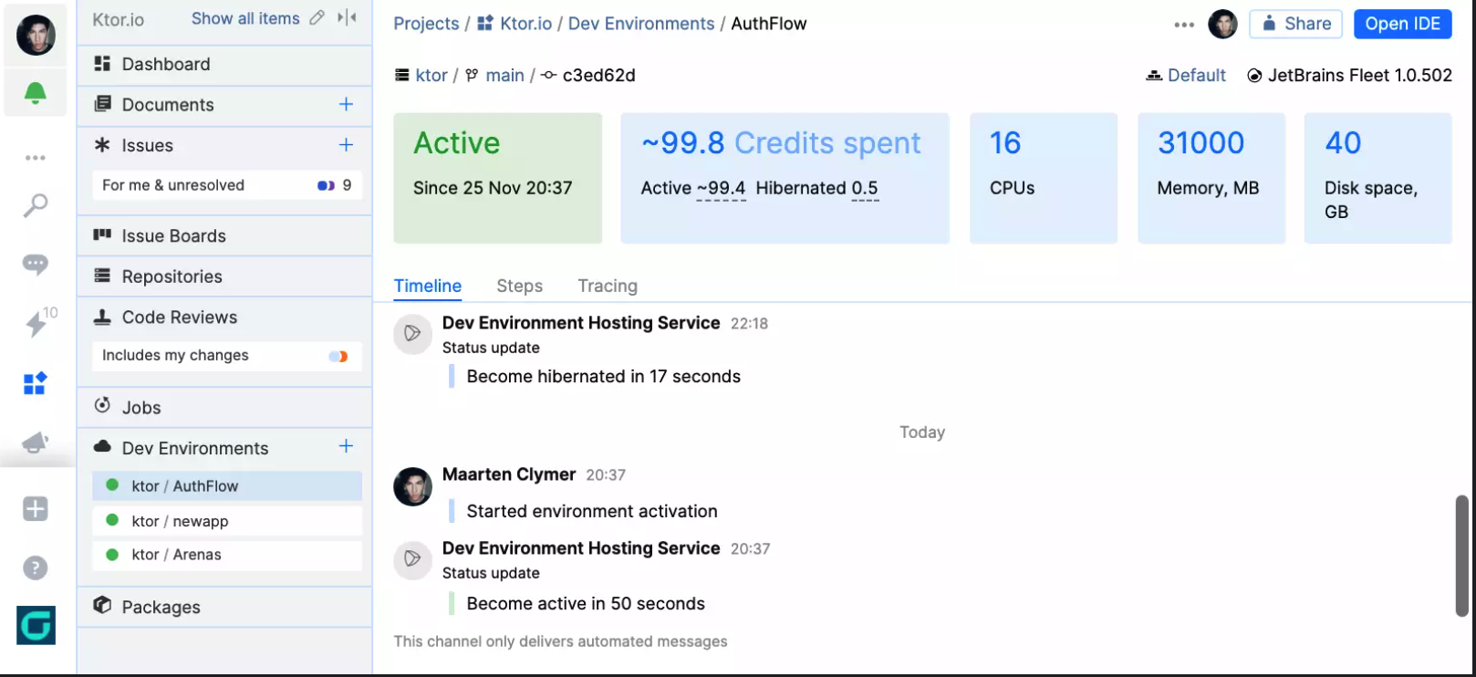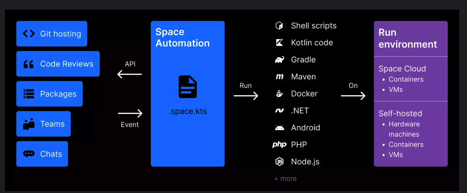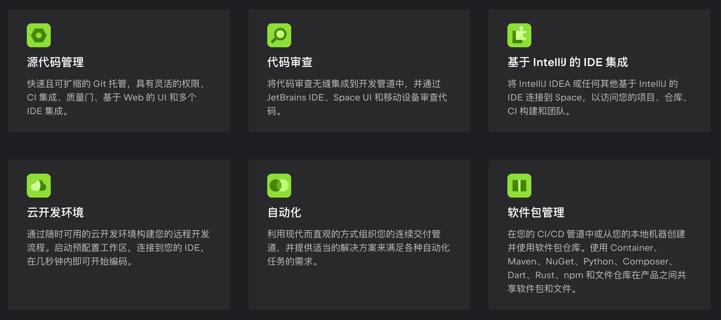 提交代码并浏览更改。审查代码、创建合并请求。创建、管理、共享和重现云开发环境。自动执行您的工作流和 CI/CD 管道。存储和管理软件包仓库。将 JetBrains IDE 连接到 Space。