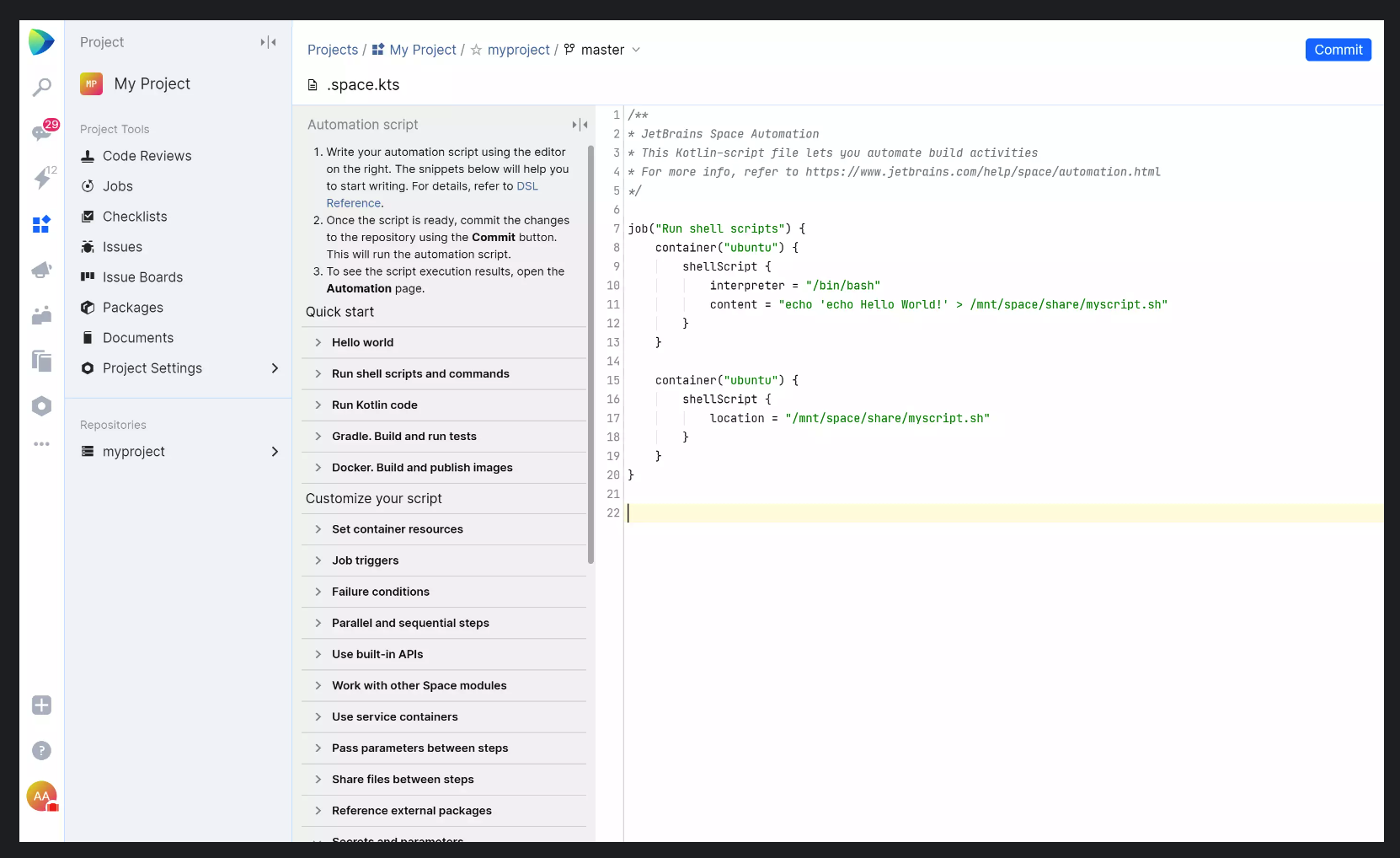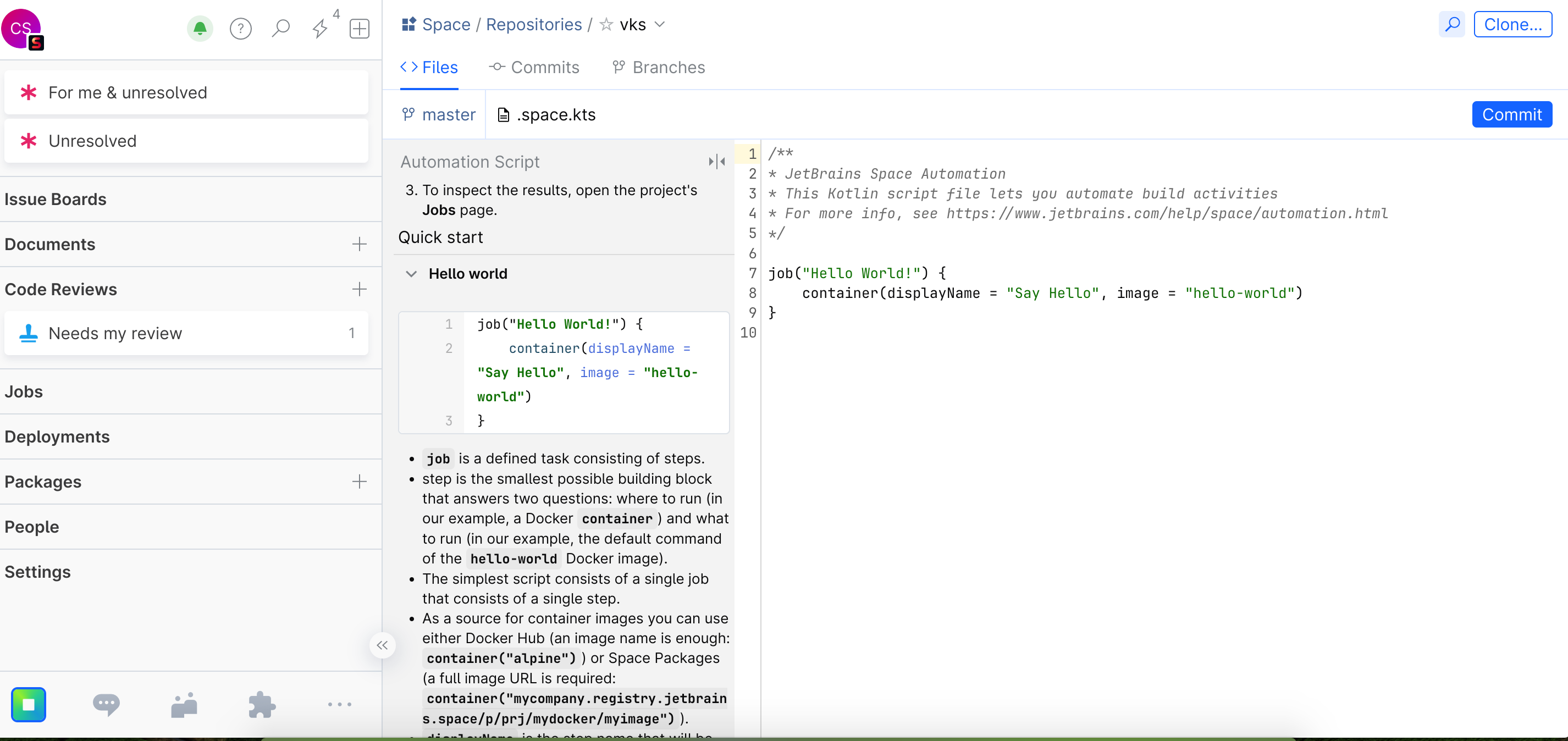Space 中的自动化使用脚本进行配置。 Space 中的 Automation UI 用于可视化脚本结果:日志、测试和工件。 Space 使用基于 Kotlin 的 DSL 作为其脚本语言,并计划在未来支持 YAML。
