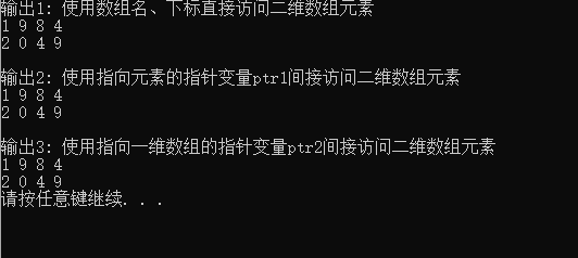 printf("\n输出2: 使用指向元素的指针变量ptr1间接访问二维数组元素\n");