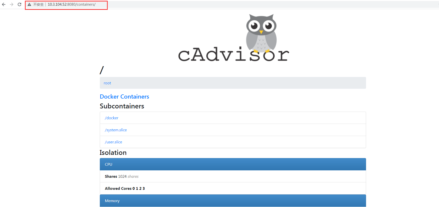 注:出现这个结果表示cAdvisor组件安装成功,注意:另外两台dockerhost主机也需安装cAdvisor组件操作完全一样,安装完成后请自行打开浏览器验证。