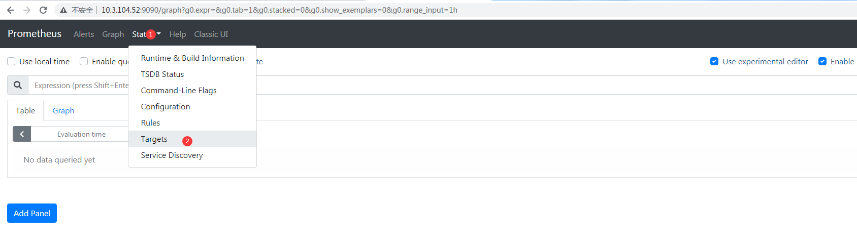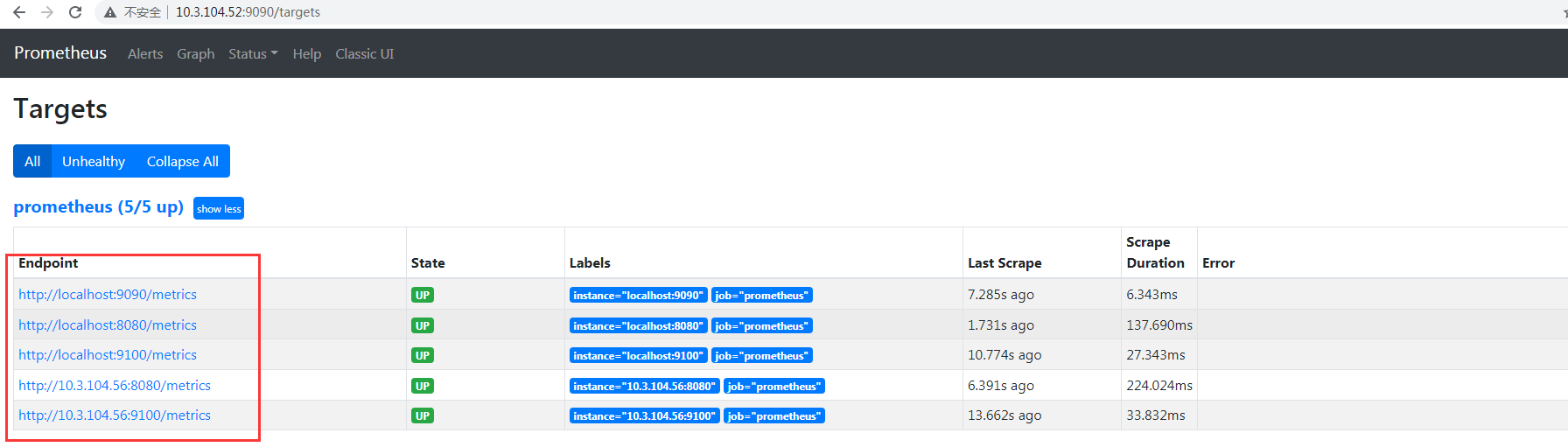 [root@docker01 ~]# docker run -d -p 9090:9090 --name prometheus prom/prometheus [root@docker01 ~]# docker cp prometheus:/etc/prometheus/prometheus.yml ./ [root@docker01 ~]# vim prometheus.yml static_configs: - targets: ['localhost:9090','localhost:8080','localhost:9100','10.3.104.56:8080','10.3.104.56:9100'] Ps:用于指定监控本机的9090、8080、9100这三个端口,docker02主机的8080、9100也是这两个端口。 8080端口运行的是cAdvisor服务 9100端口运行的是node-exporter服务 9090端口运行的就是Prometheus服务