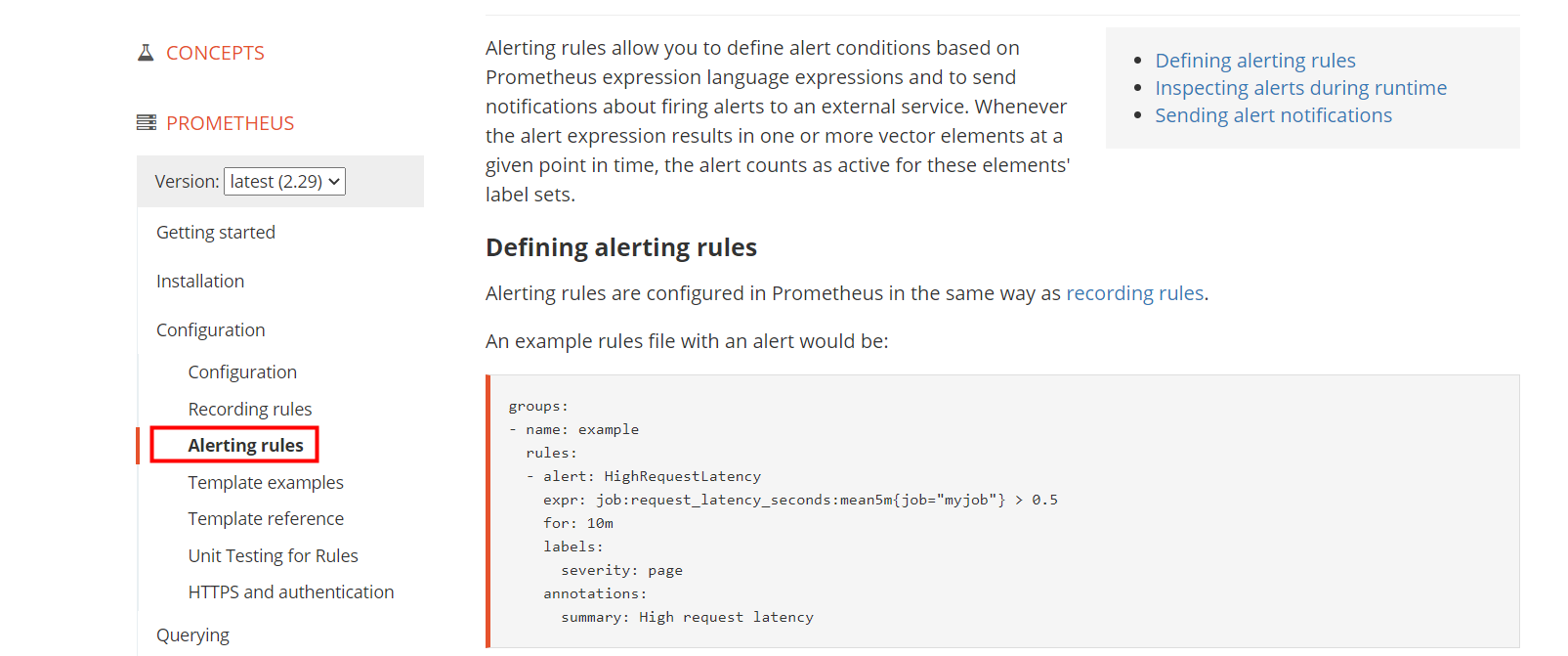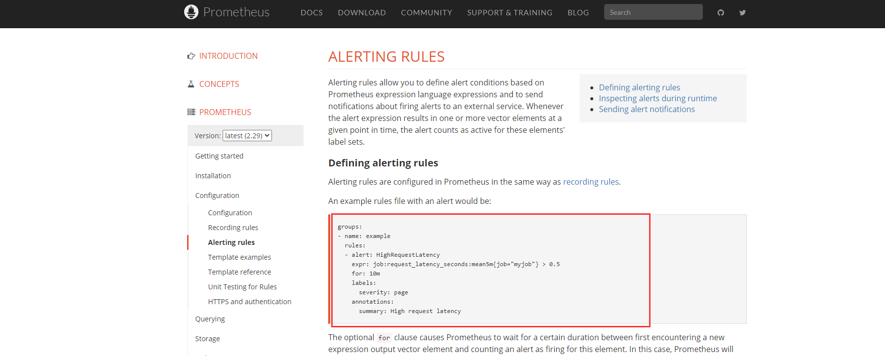 注:该 rules 目的是监测 node 是否存活,expr 为 PromQL 表达式验证特定节点 job=“node-exporter” 是否活着,for 表示报警状态为Pending 后等待 15s 变成 Firing 状态,一旦变成 Firing 状态则将报警发送到 AlertManager,labels 和 annotations 对该 alert 添加更多的标识说明信息,所有添加的标签注解信息,以及 prometheus.yml 中 该 job 已添加 label 都会自动添加到邮件内容中,更多关于 rule 详细配置可以参考它的官方文档: https://prometheus.io/docs/prometheus/latest/configuration/recording_rules