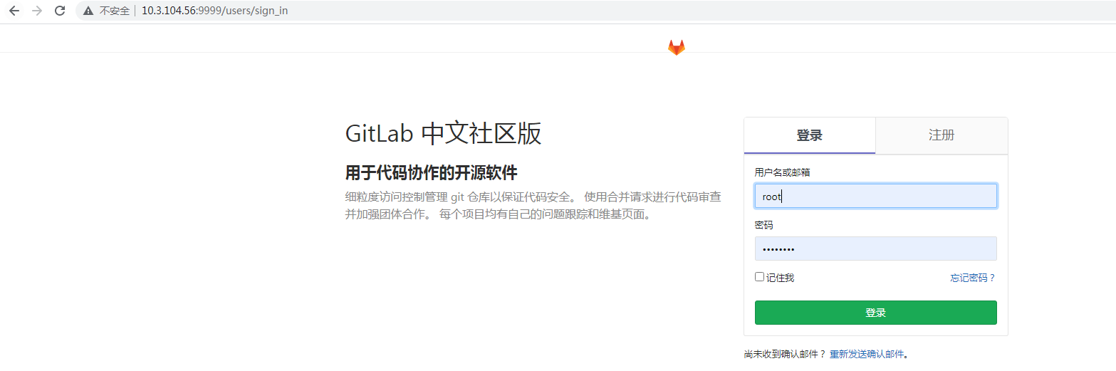 [root@docker02 ~]# mkdir -p /data/gitlab [root@docker02 ~]# cd /data/gitlab [root@docker02 ~]# docker run -d \ --name gitlab \ -p 8443:443 \ -p 9999:80 \ -p 9998:22 \ -v $PWD/config:/etc/gitlab \ -v $PWD/logs:/var/log/gitlab \ -v $PWD/data:/var/opt/gitlab \ -v /etc/localtime:/etc/localtime \ --restart=always \ wuxinchun/gitlab-ce-zh:latest