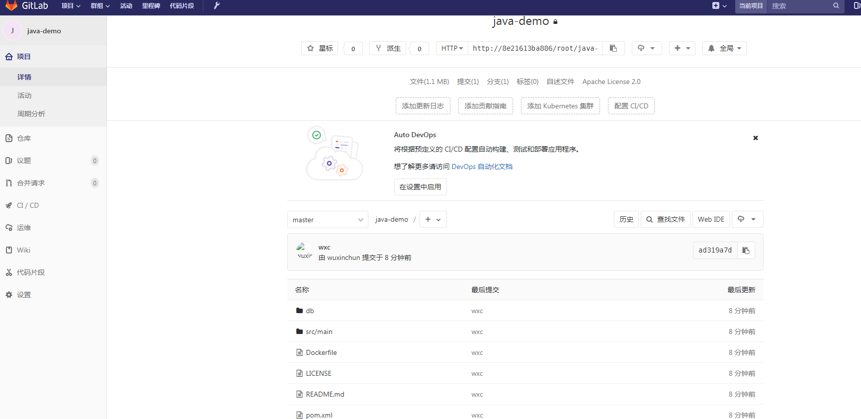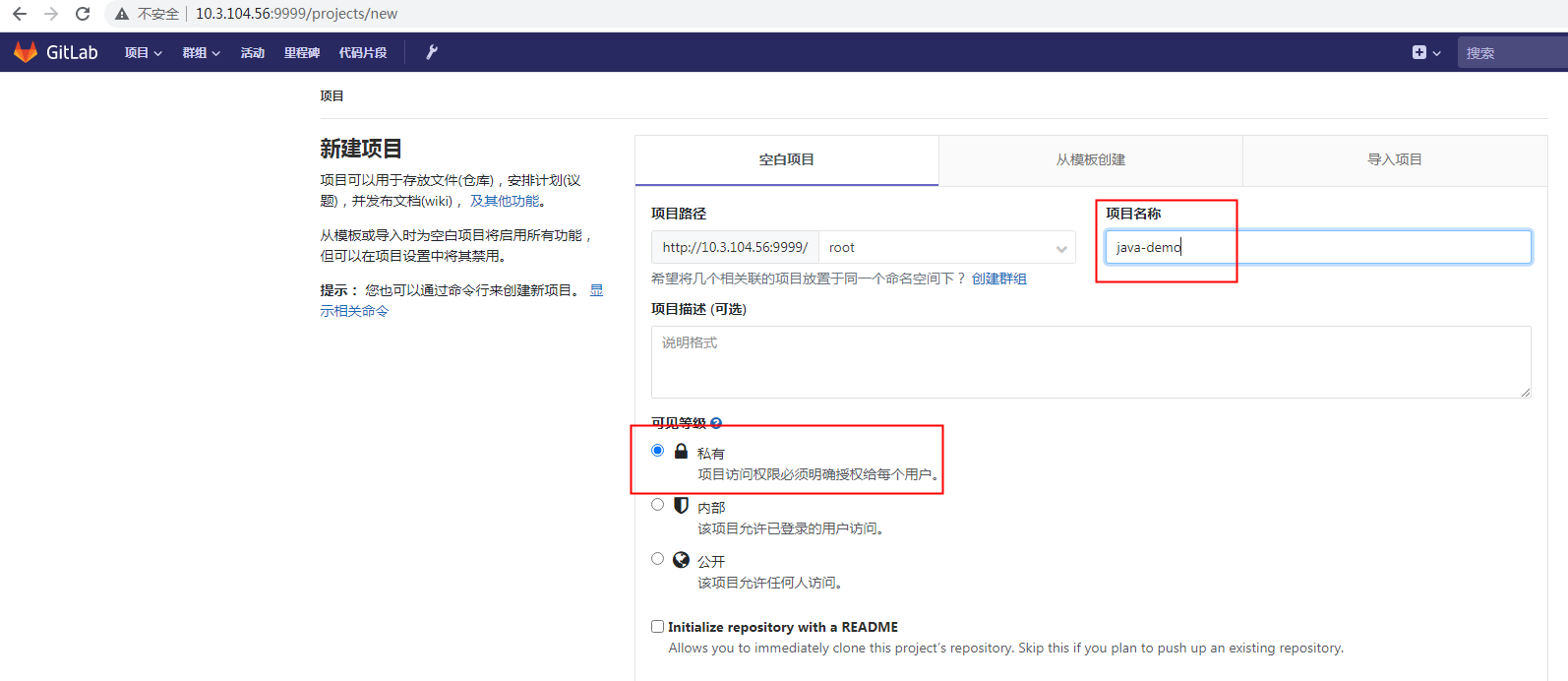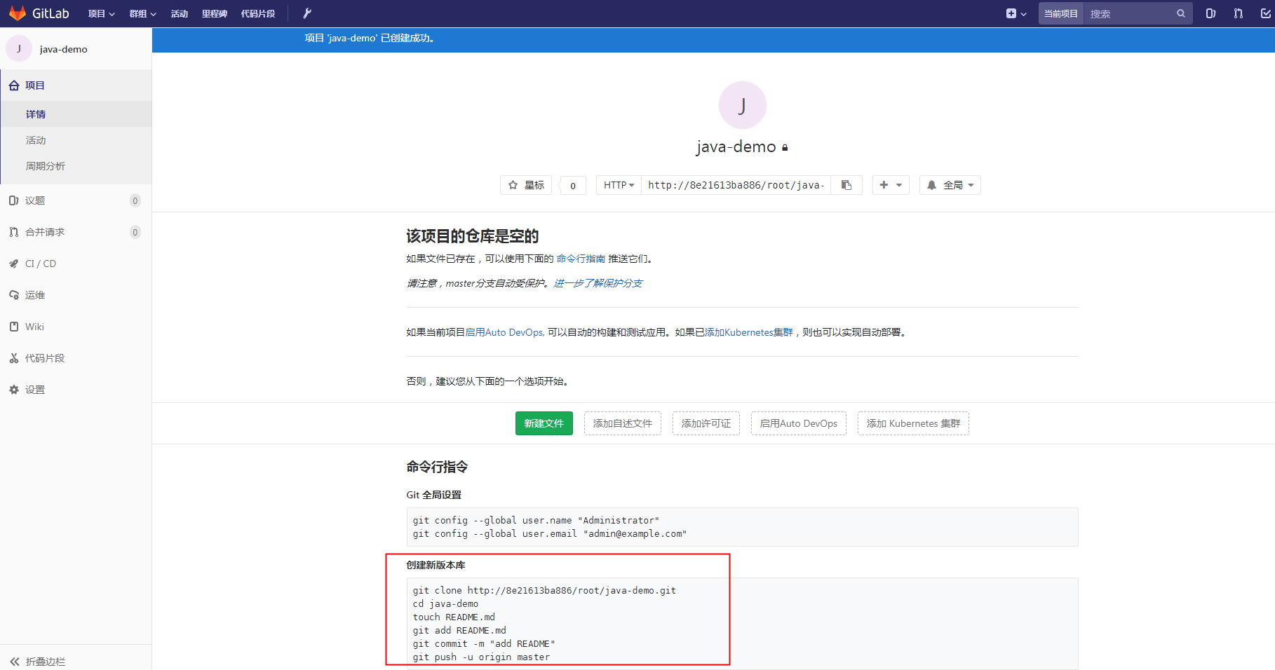 [root@docker02 data]# yum -y install git [root@docker02 data]# git clone http://10.3.104.56:9999/root/java-demo.git Cloning into 'java-demo'... Username for 'http://10.3.104.56:9999': root Password for 'http://root@10.3.104.56:9999': warning: You appear to have cloned an empty repository.