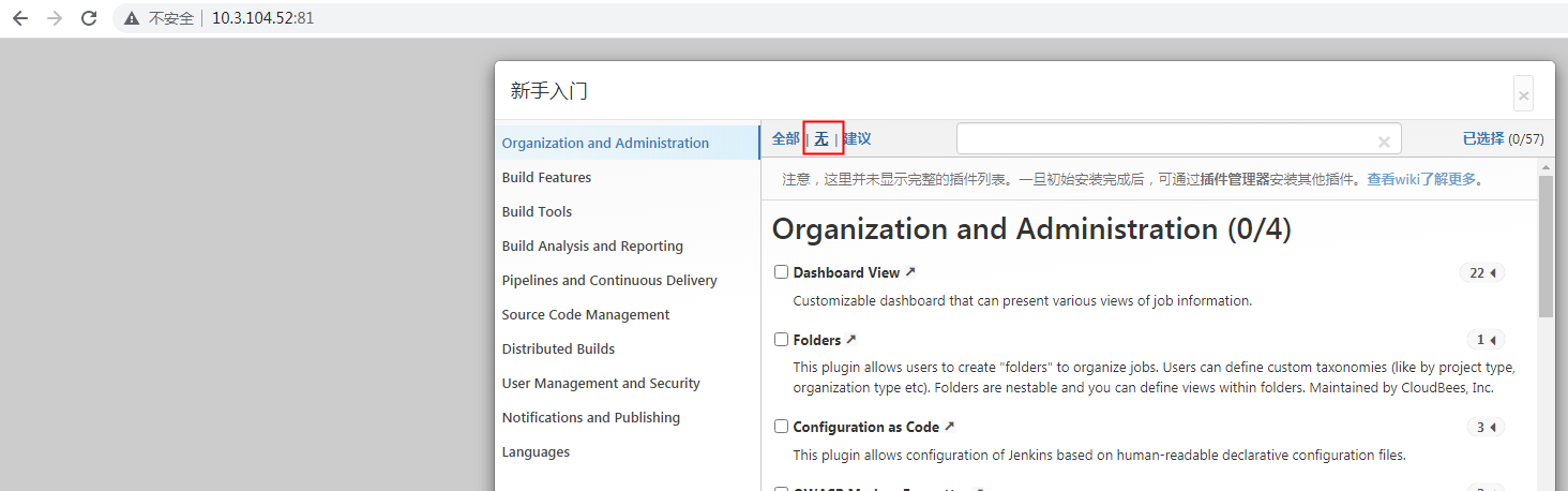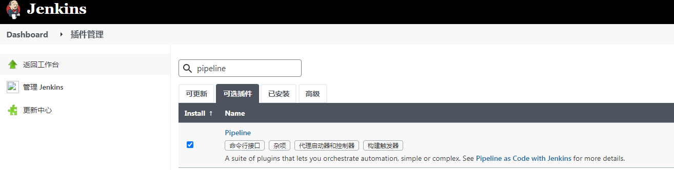 【管理Jenkins->系统配置-->管理插件-->搜索 Localization: Chinese (Simplified),git/pipeline】选中点击安装
