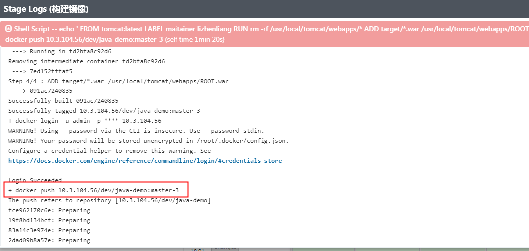 [root@docker01 conf]# docker images REPOSITORY TAG IMAGE ID CREATED SIZE 10.3.104.56/dev/java-demo master-4 cc901da59e29 2 minutes ago 686MB [root@docker01 conf]# docker ps -a CONTAINER ID IMAGE COMMAND CREATED STATUS PORTS NAMES 74b38842d5a7 10.3.104.56/dev/java-demo:master-4 "catalina.sh run" About a minute ago Up About a minute 0.0.0.0:88->8080/tcp tomcat-java-demo