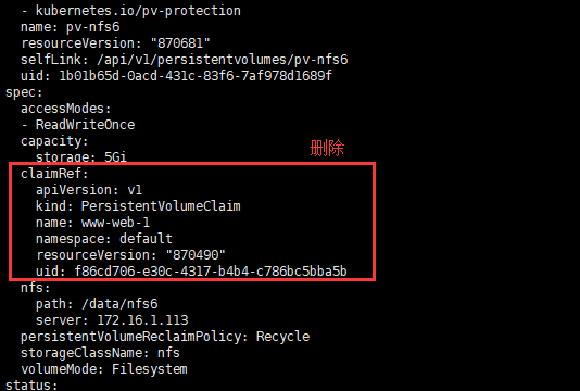 ### 由下可见,还有一个pv虽然声明被删除,但资源尚未回收;我们只需等一会儿即可 [root@k8s-master pv-pvc]# kubectl get pv -o wide NAME CAPACITY ACCESS MODES RECLAIM POLICY STATUS CLAIM STORAGECLASS REASON AGE VOLUMEMODE pv-nfs1 1Gi RWO Recycle Available nfs 90m Filesystem pv-nfs2 3Gi RWO Recycle Available nfs 90m Filesystem pv-nfs3 5Gi RWO Recycle Available slow 90m Filesystem pv-nfs4 10Gi RWO Recycle Available nfs 90m Filesystem pv-nfs5 5Gi RWX Recycle Available nfs 90m Filesystem pv-nfs6 5Gi RWO Recycle Released default/www-web-1 nfs 90m Filesystem [root@k8s-master pv-pvc]# ### 可见该pv还有引用 [root@k8s-master pv-pvc]# kubectl get pv pv-nfs6 -o yaml apiVersion: v1 kind: PersistentVolume metadata: ……………… spec: accessModes: - ReadWriteOnce capacity: storage: 5Gi ################### 可见仍然在被使用 claimRef: apiVersion: v1 kind: PersistentVolumeClaim name: www-web-1 namespace: default resourceVersion: "1179810" uid: d4d8943c-6b16-45a5-8ffc-691fcefc4f88 ################### nfs: path: /data/nfs6 server: 172.16.1.113 persistentVolumeReclaimPolicy: Recycle storageClassName: nfs volumeMode: Filesystem status: phase: Released