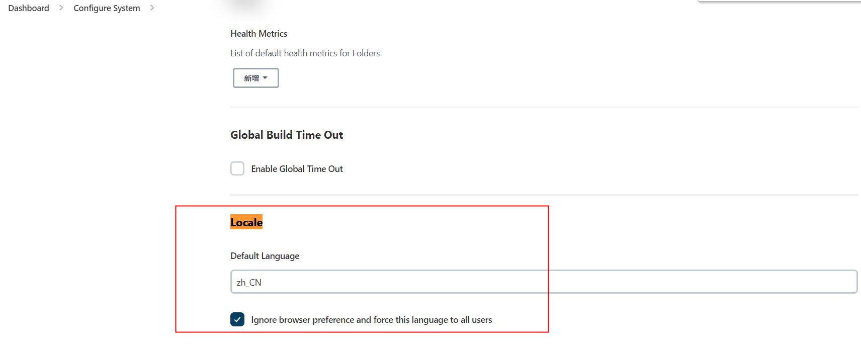 3)进入Manage Jenkins中,点击Configure System,找到Locale,设置为zh_CN后保存