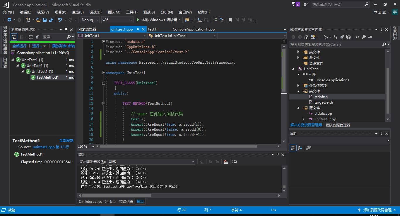 ##**2. 练习自动单元测试技术** ###**编写test.h头文件** **编写test.h头文件,定义test类。代码如下:** '''C++ class test {//计算类 public: bool isodd(int sum); }; '''