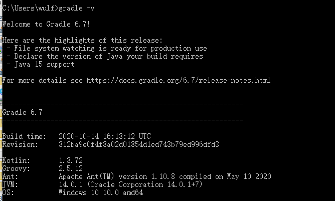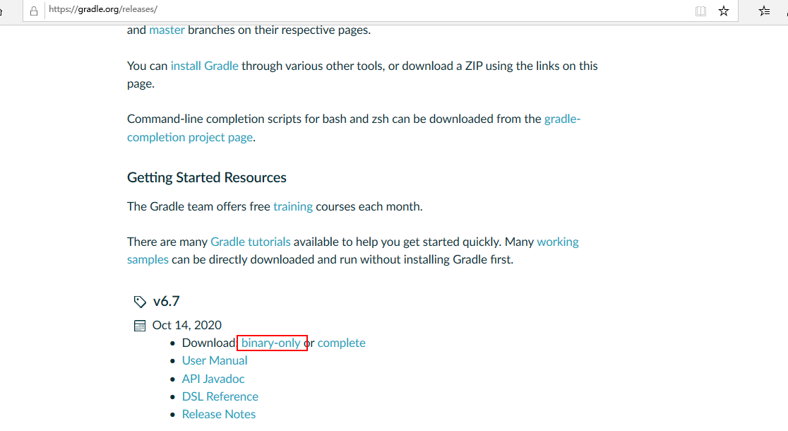 1.安装:到gradle官网https://gradle.org/releases/下载安装包,最新版本是6.7,选二进制安装包,外网不好下,多试试,二进制的包少个几十兆,能少花一些时间: