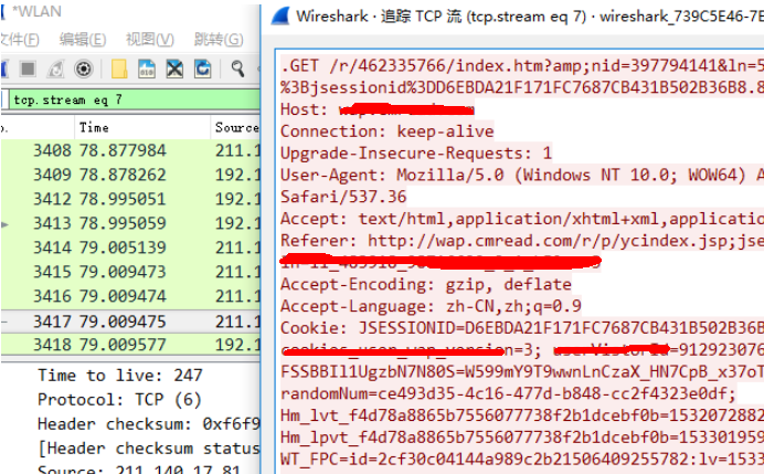 右击上端面板一条网络报文 -> “追踪流” -> “TCP流”,可以看到请求客户端和服务端的所有会话: