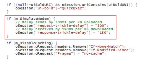 利用抓包工具fidder进行弱网设置,fiddler主要是使用Rules->Performance->Simulate Modem Speeds 功能进行的网络延迟模拟,点击Rules ->Customize Rules进行设置,打开自定义脚本编辑器,如图所示: