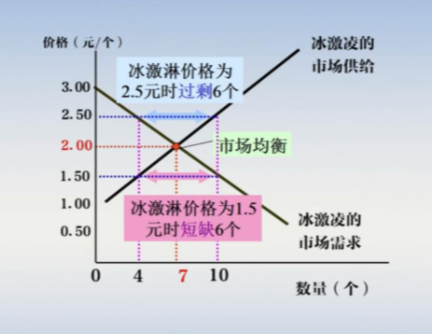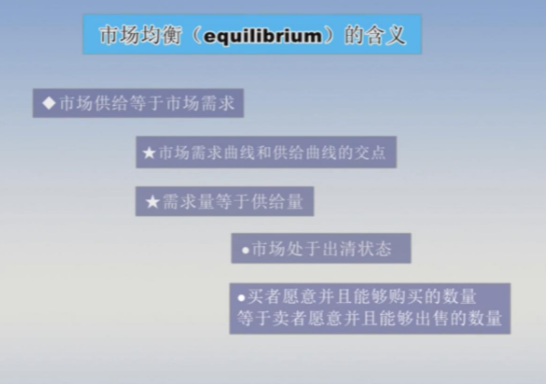 - 市场均衡:当市场供给等于市场需求时,价格这个因素就会处在一个相对静止比较稳定的状态。这个状态就是市场均衡价格(市场出清)。(需求曲线与价格曲线的交点)(是由价格决定的) //人不是标准物,但是产出价值是标准物。