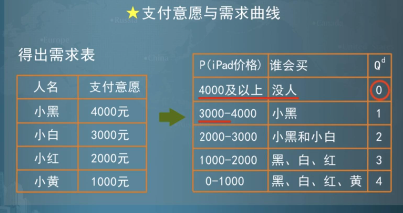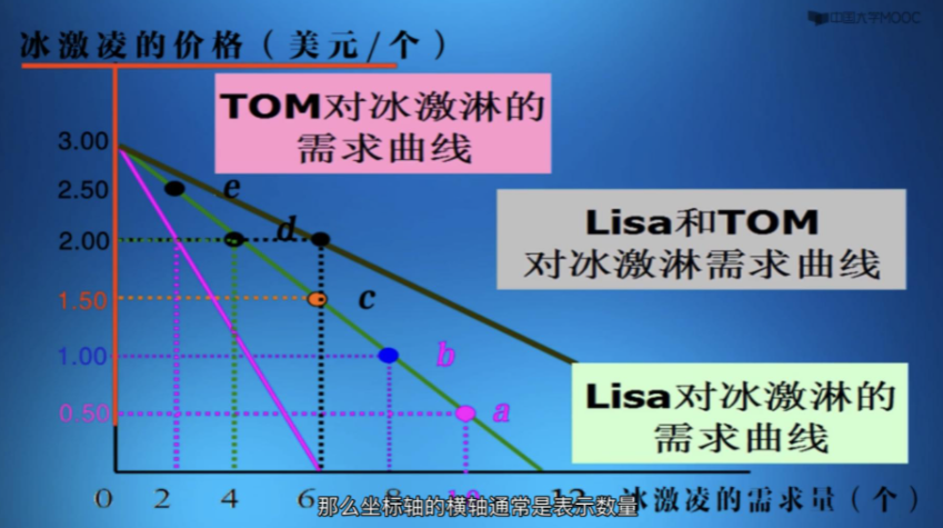 - 需求曲线:个人(单个人在不同价格水平下的需求量)+市场(所有人在不同价格下的需求量综合、由个人需求曲线横向加总而得)。只有市场的价格曲线才能决定价格。(需求曲线表现得是同一个价格下,我们社会上的买者更多了还是更少了)