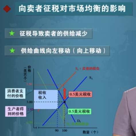 - 费用(成本 税收)增加,会导致利润降低,导致提高价格,需求量降低,导致供应者减少,供应量降低。达到新的市场均衡。