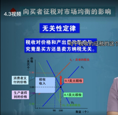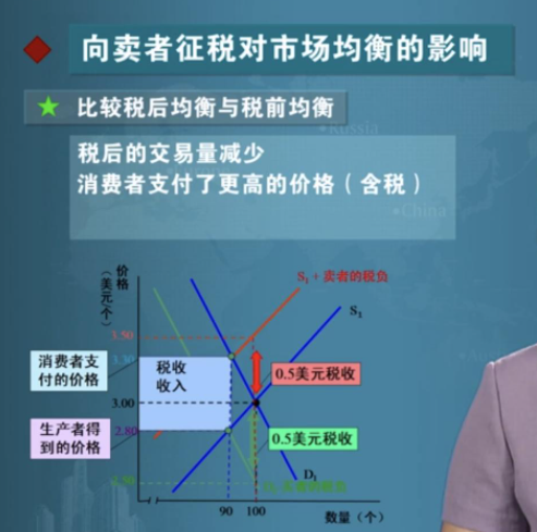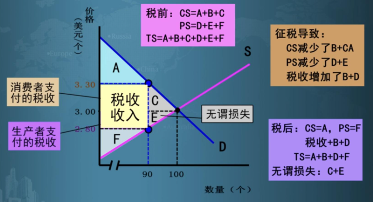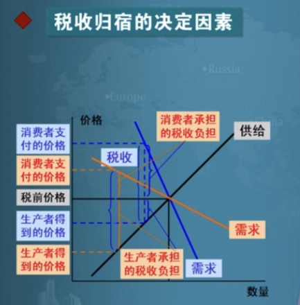 - 税收虽然看上去是单向,但实际上是消费者和生产者一起承担的。