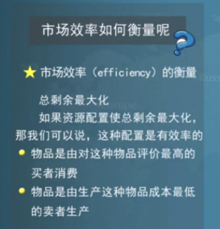 - 市场效率。由评价最高的人消费,由成本最低的厂家生产。