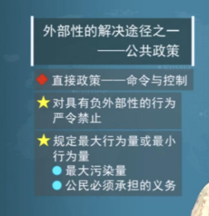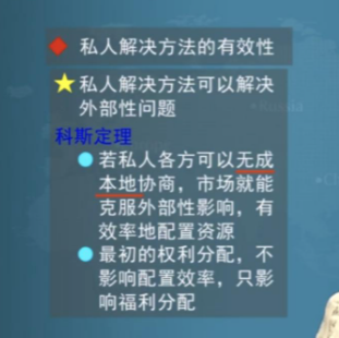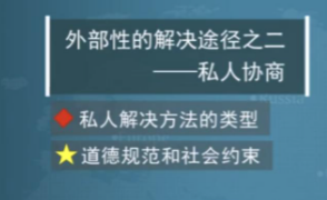 - 面对外部性的私人协商(私人结果=有效率的结果,无论开始怎么样分配,最后都能达到平衡):道德规范和社会约束、慈善行为、企业并购(外部性变成内部化)