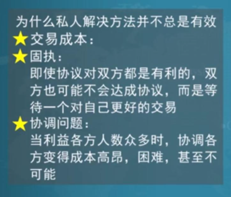 - 为什么私人解决方法不总是奏效:交易成本(一个群体中界定谁高谁低,分配过程的成本)、固执(等待更好地成交)、协调问题(人多的时候协调困难)。