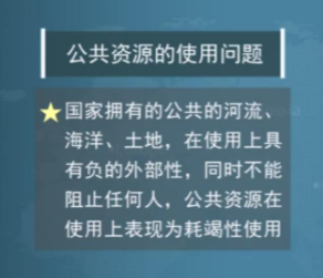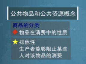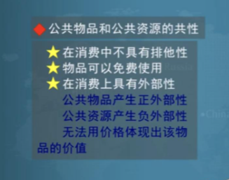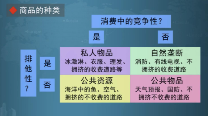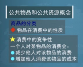 - 公共物品、公共资源。物品的排他性(我用了你不能用)与竞争性(我用了你用就会变贵,我用了你就不需要再用)。私人不提供公共物品。