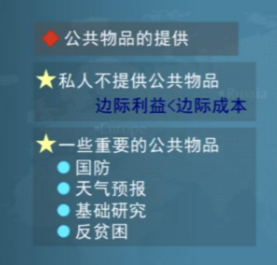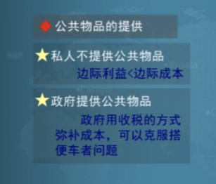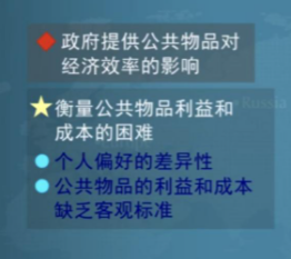 - 政府可以提供公共物品,用税收作为成本。但是由于衡量困难,无法做到最有效率。