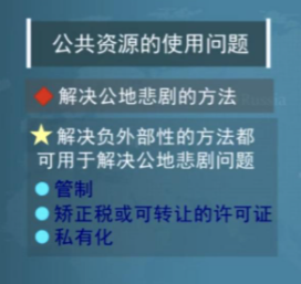 - 解决公地悲剧的方法就是解决负外部性的方法。